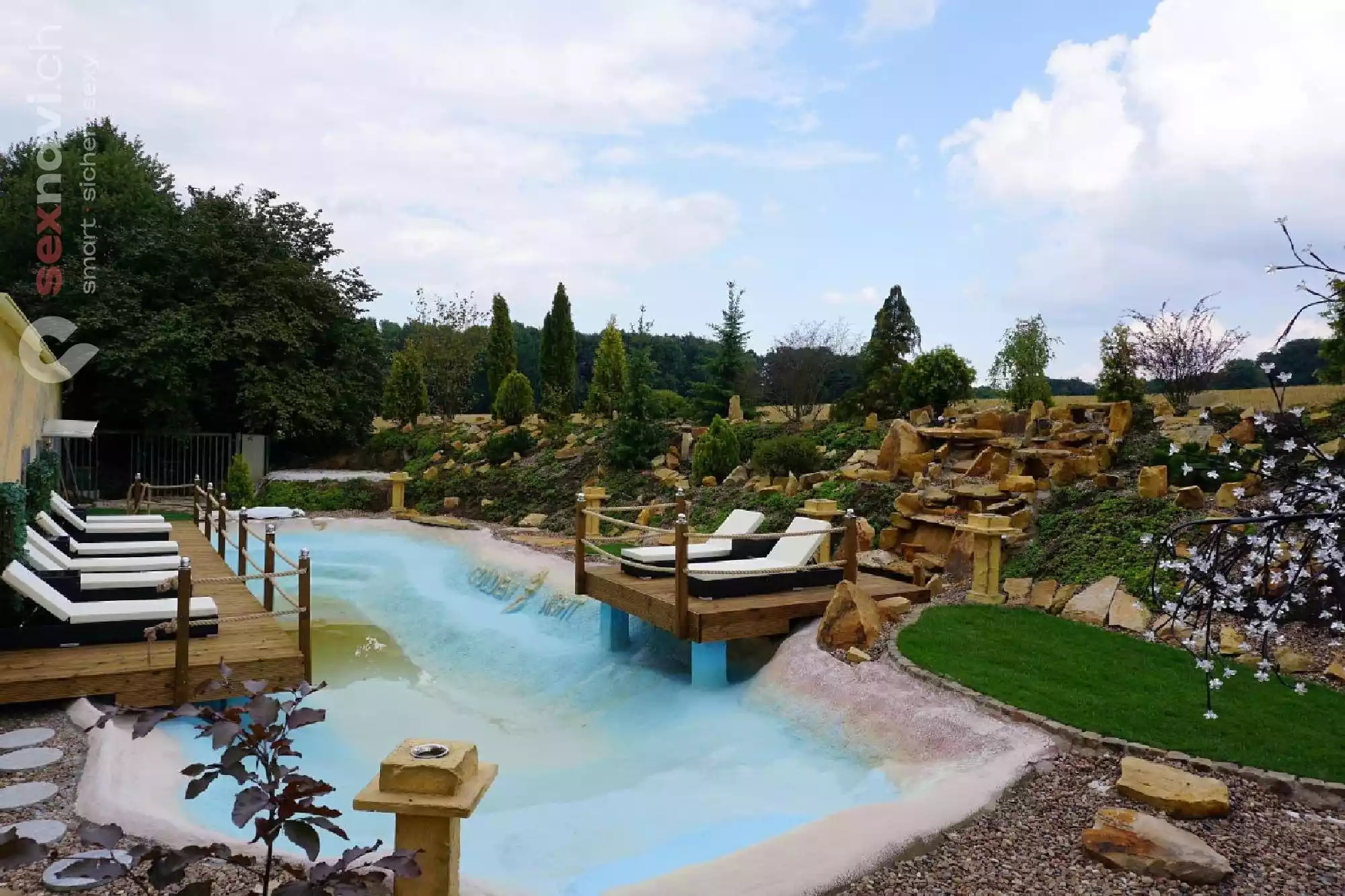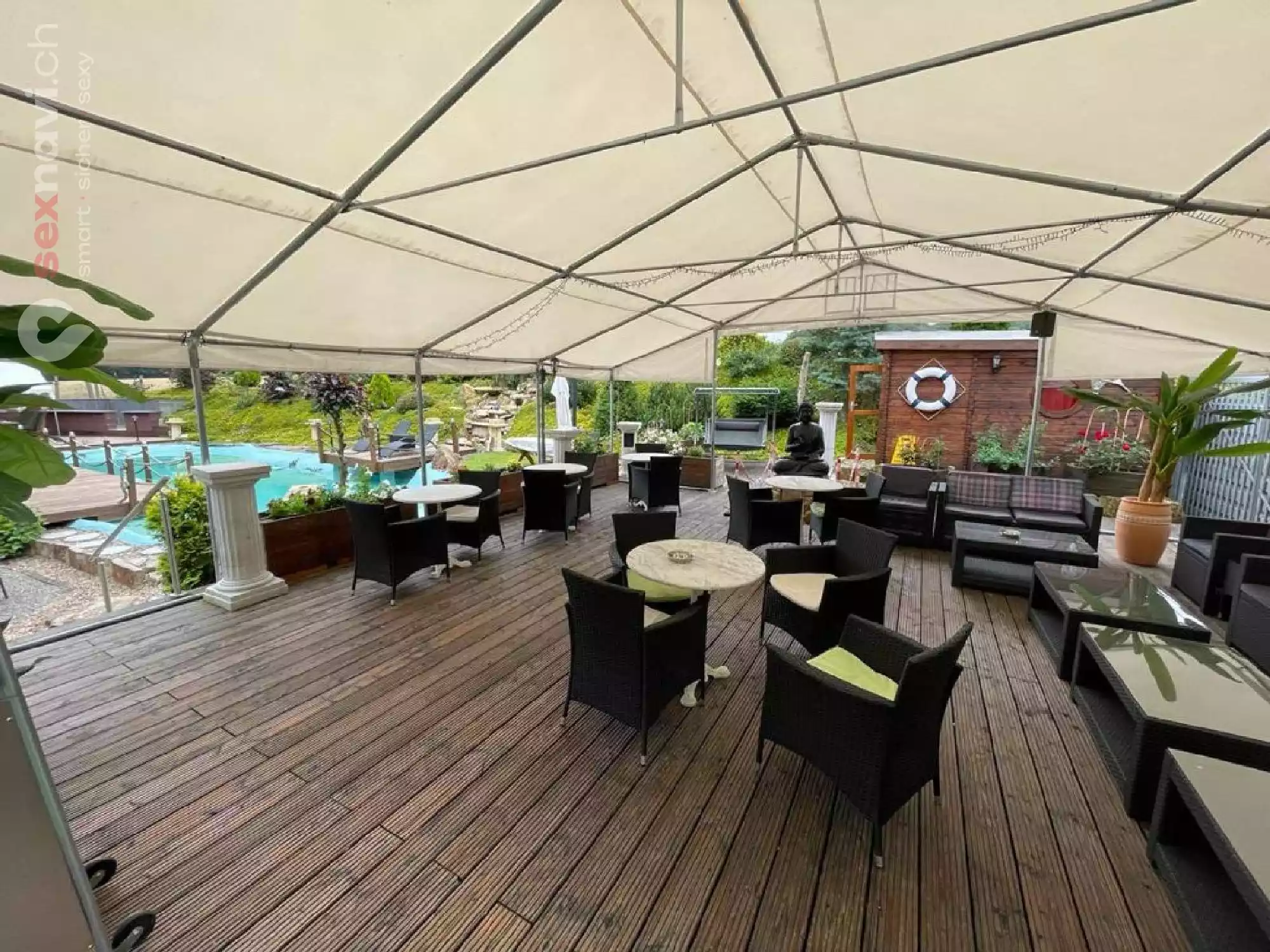 Neben den Innenräumlichkeiten des Golden Night Saunaclubs, gibt es auch noch einen großzügigen Garten mit Terasse, welchen man zum Sonnenbaden, relaxen und genießen sehr gut nutzen kann.